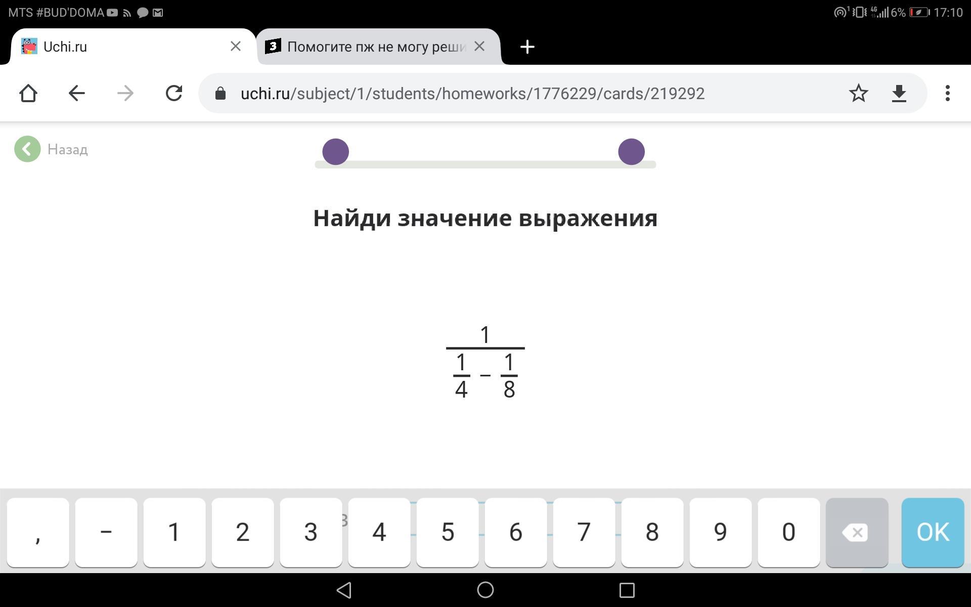 1÷(1/4 - 1/8) = 1÷(2/8 - 1/8) = 1÷1/8 = 1×8 = 8