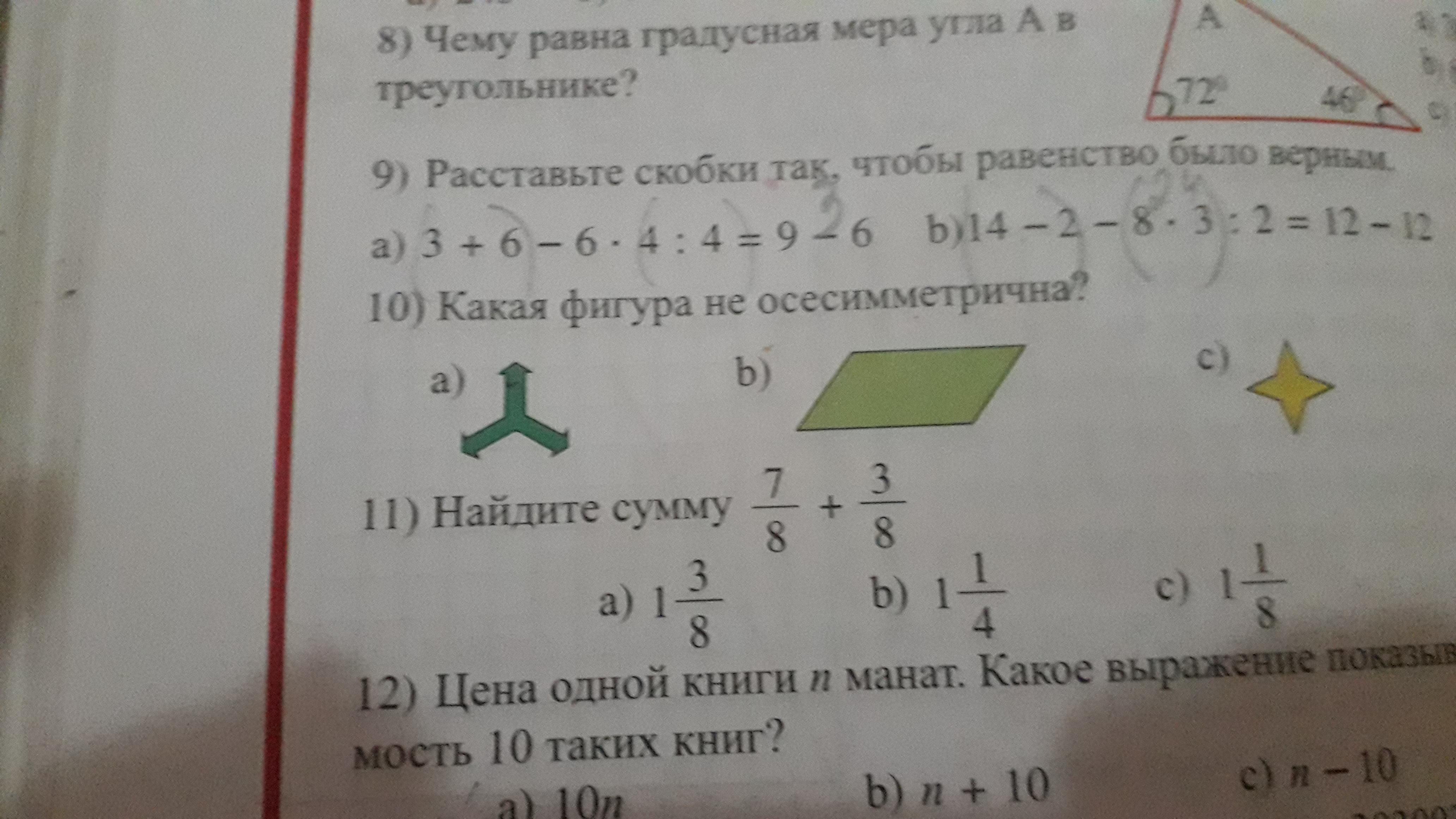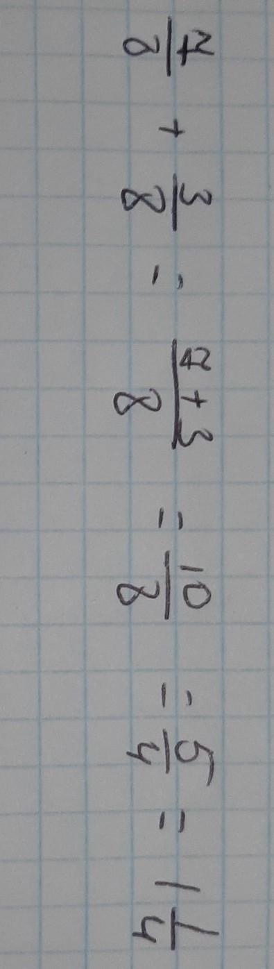 7/8+3/8=10/8. Выделяем целую часть и сокращаем. 10/8 = одна целая две восьмых = одна целая одна четвертая