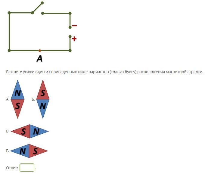 Ученик собрал электрическую цепь согласно схеме, изображенной на рисунке, в точку A поместил магнитную стрелку и замкнул ключ. Определи положение, которое займет стрелка.