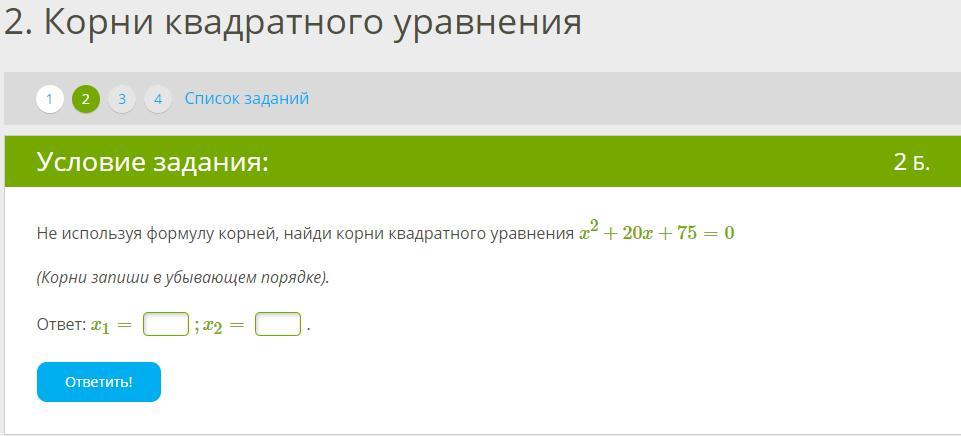 Не используя формулу корней, найди корни квадратного уравнения x2+20x+75=0