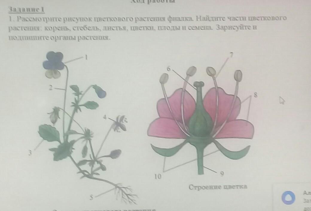 1. Рассмотрите рисунок цветкового растения фиалка. Найдите части цветкового