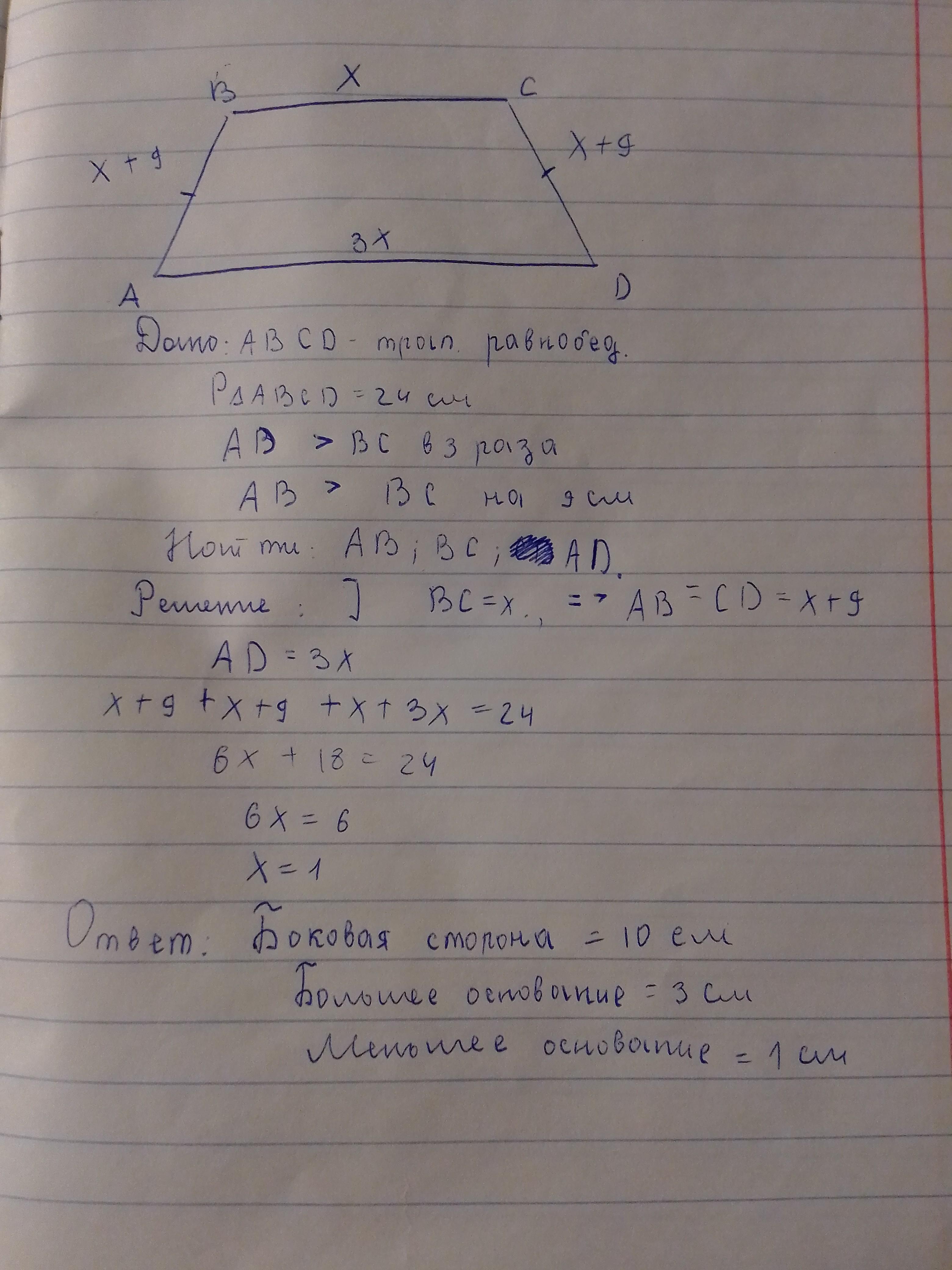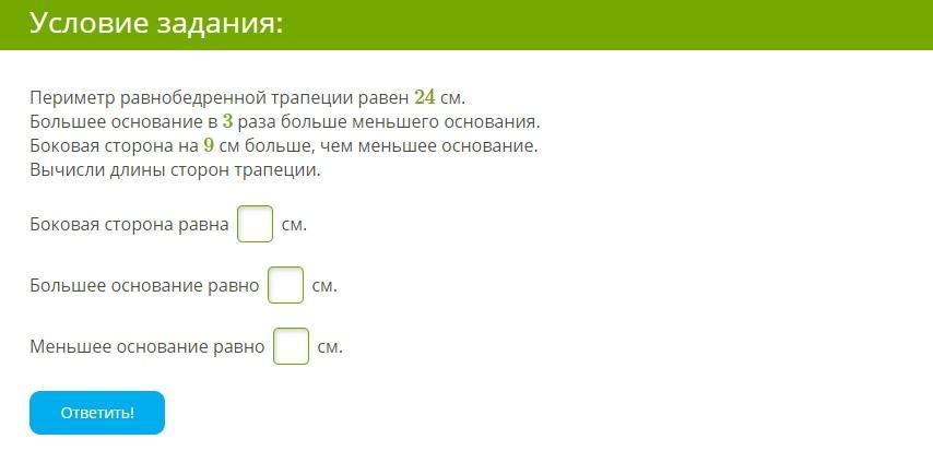 Боковая сторона на 6 см больше, чем меньшее основание.