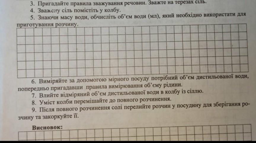 2.обчисліть массу кухонної солі і масу води, які необхідно взяти для приготування розчину із заданою масовою часткою солі 5%