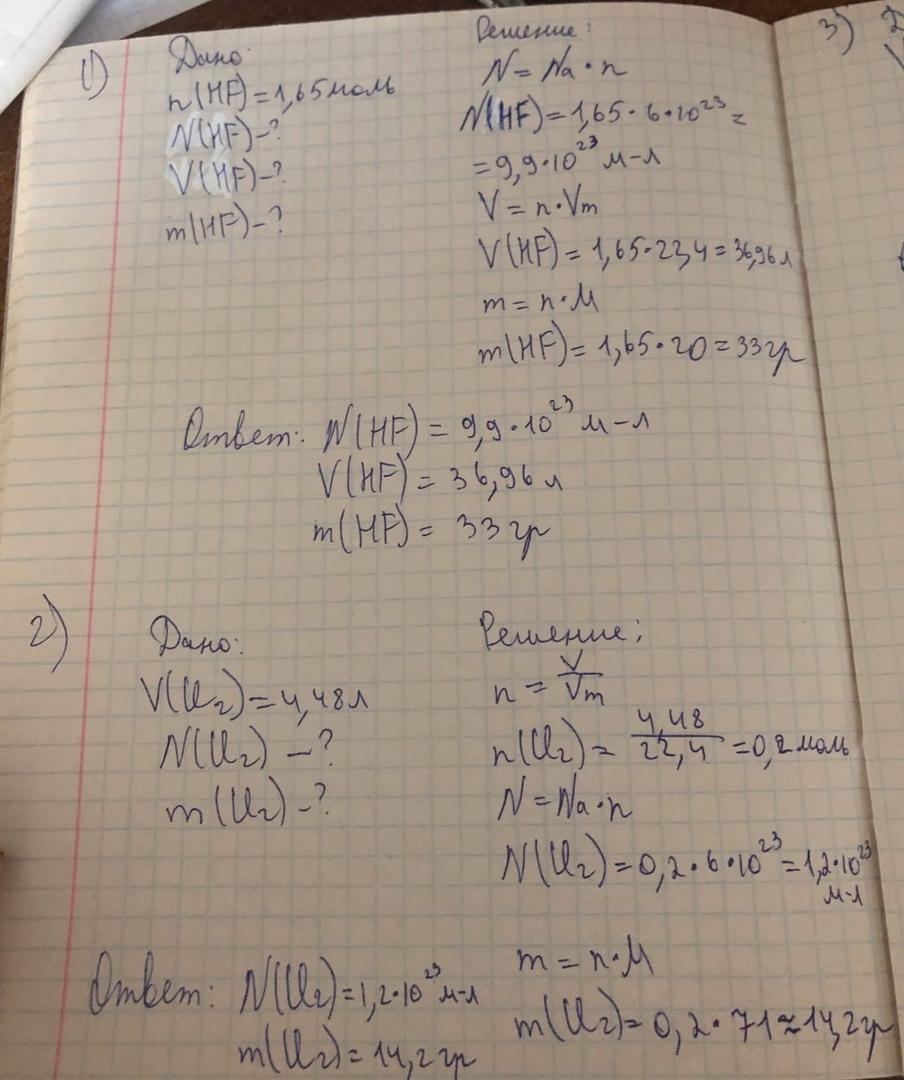 1. Найдите число молекул, объём (н. у.) и массу 1,65 моль фтороводорода.