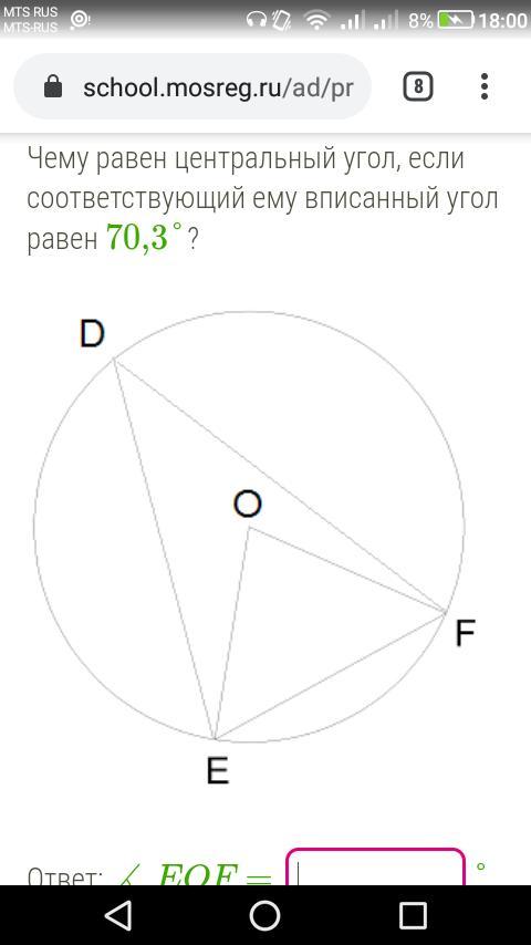 Чему равен центральный угол, если соответствующий ему вписанный угол равен 70,3°