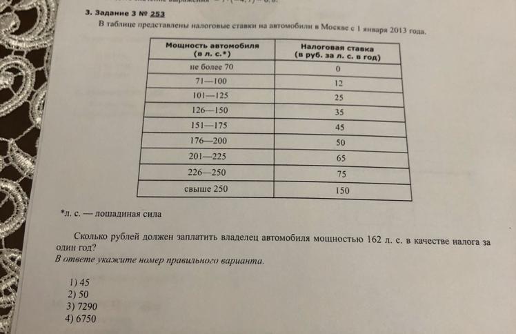 нужно посмотреть в первый столбик, там нужно найти строчку 151-175 л.с. 162 л.с. как раз входят туда. затем посмотреть на второй столбик , там написана налоговая ставка в год видим цифру 45. в ответе под номером 1 как раз нужная нам ставка , отсюда следует ответ 1