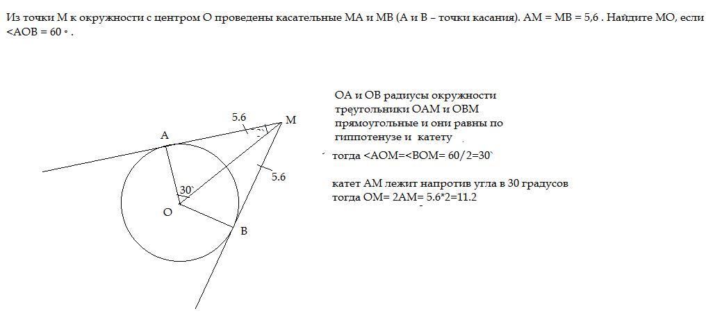 Из точки М к окружности с центром О проведены касательные МА и МВ (А и В – точки касания). АМ = МВ = 5,6 . Найдите МО, если <АОВ = 60◦.