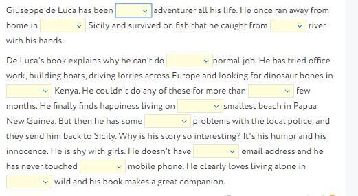 De Luca's book explains why he can't do a normal job. He has tried office work, building boats, driving lorries across Europe and looking for dinosaur bones in _ Kenya. He couldn't do any of these for more than a few months. He finally finds happiness living on the smallest beach in Papua New Guinea. But then he has some _ problems with the local police, and they send him back to Sicily. Why is his story so interesting? It's his humour and his innocence. He is shy with girls. He doesn't have an email address and he has never touched a mobile phone. He clearly loves living alone in the wild and his book makes a great companion.