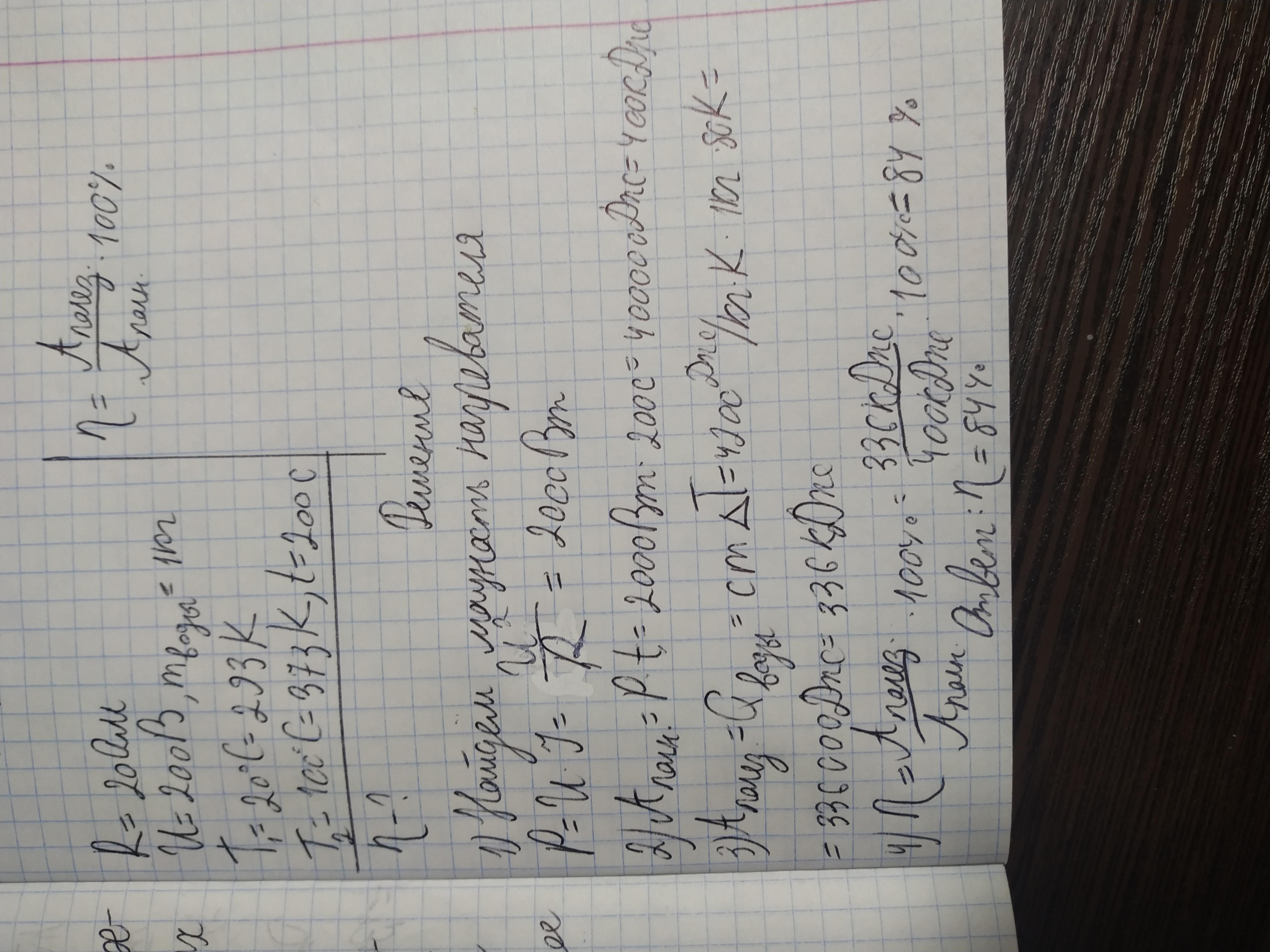 Напруга на електричному нагрівачі з опором 20 Ом дорівнює 200 В. За допомогою цього нагрівача воду масою 1 кг нагріли від 20 ∘С до 100 ∘С за 200 с. Визначте коефіцієнт корисної дії (ККД) цієї нагрівальної установки. Питома теплоємність води дорівнює 4200 Дж/(кг⋅К). Відповідь запишіть у відсотках.