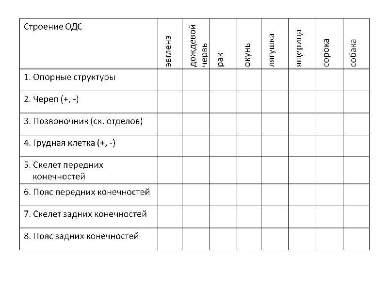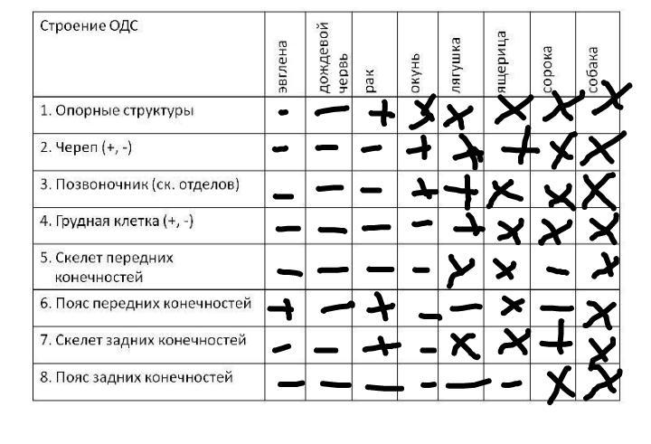 Решите пожалуйста таблицу по биологии, дам 35 баллов. Нужно поставить + или - в зависимости от того что есть у данных созданий