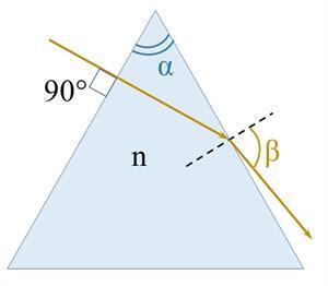 На рисунке изображён ход луча в правильной треугольной призме. Известно, что угол β — это угол преломления луча, выходящего из призмы. Также известно, что sinβ=0,86. Найди показатель преломления линзы.