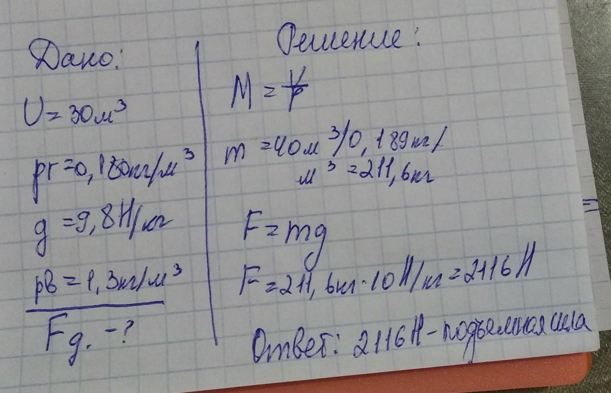 Помогите пожалуйста решить задачу , не идёт предмет . В воздух запущен шар объёмом 40 м3 наполненный гелием , определить подъемную силу шара .Дано V=40м3 pг= 0,180кг/м3 g=9,8 Н/кг pв= 1,3 кг/м3 найти Fд. -?