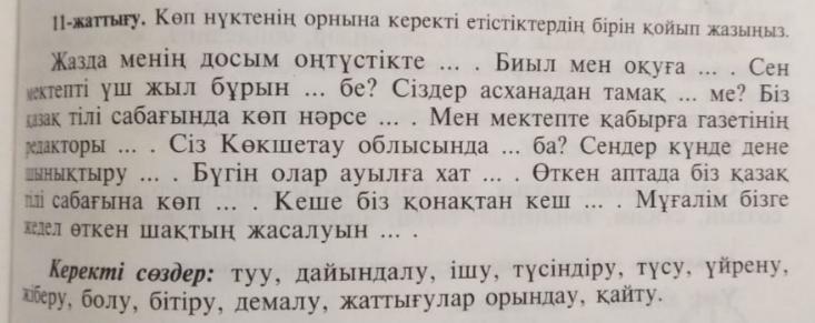Жазда менің досым оңтүстікте демалды.Биыл мен оқуға түстім. Сен мектепті үш жыл бұрын бітіргенсің бе? Сіздер асханадан тамақ іштіңіздер ме ? Сіз қазақ тілі сабағында көп нәрсе үйрендіңіз бе ? Мен мектепте қабырға газетінің ректоры болдым.Сіз Көкшетау облысында болып қайтыңыз ба ? Сендер күнде дене шынықтыру жаттығуларын орындайсыңдар ма? Бүгін олар ауылға хат жіберді. Өткен аптада біз қазақ тілі сабағына көп дайындалдық. Кеше біз қонақтан кеш қайттық. Мұғалім бізге жедел өткен шақтың жасалуын түсіндірді.