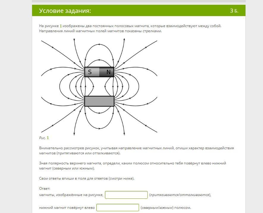 На рисунке 1 изображены два постоянных полосовых магнита, которые взаимодействуют между собой. Направления линий магнитных полей магнитов показаны стрелками.