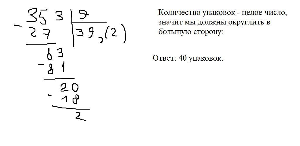 Для праздника нужно не менее 353 бутылок воды. Какое наименьшее количество упаковок придётся купить, если в каждой упаковке по 9 бутылок?