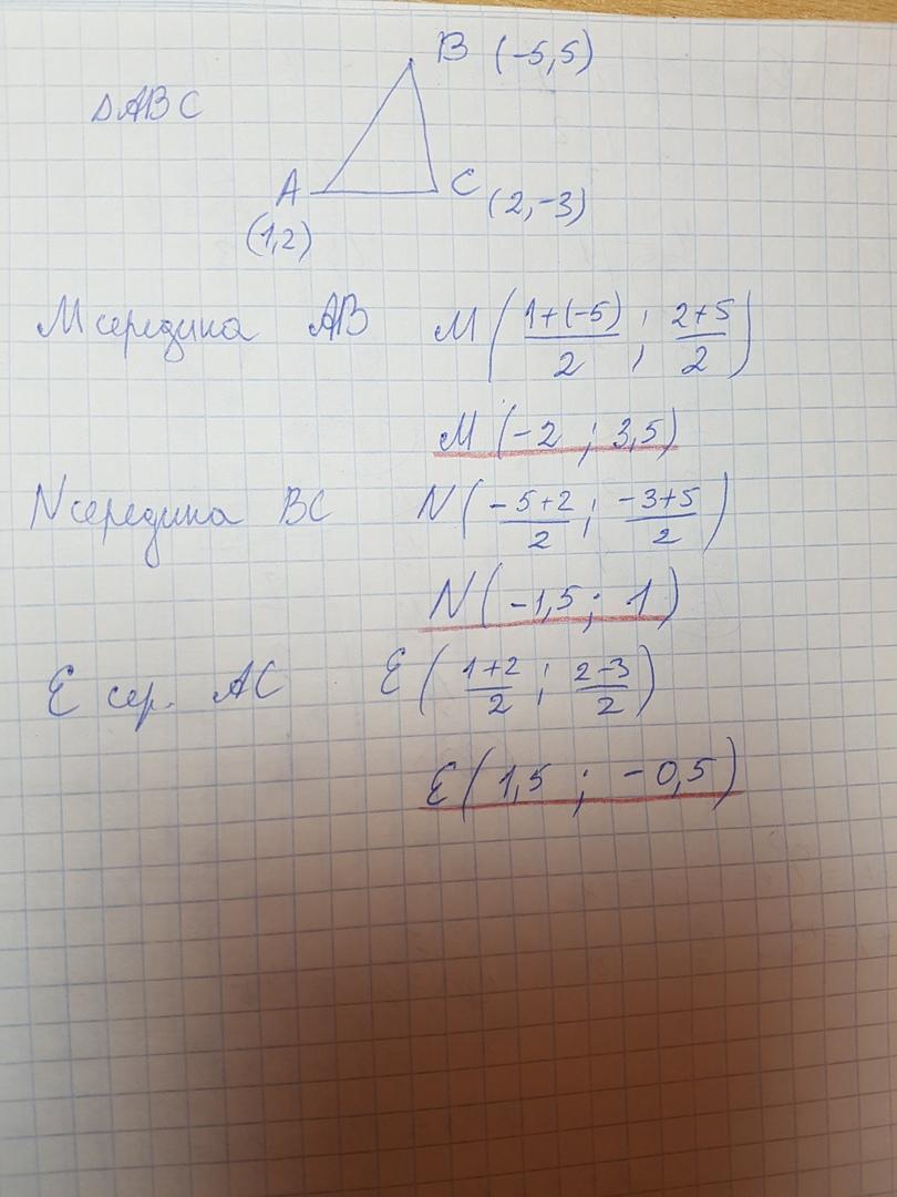 Даны вершины треугольника: А (1; 2), В (-5;-5), С (2; -3). Найдите координаты середины сторон треугольника.