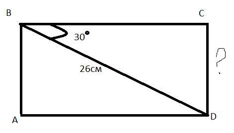 диагональ BD прямоугольника ABCD со стороной BC образует угол 30 градусов Вычислите сторону CD если диагональ BD равна 26 см Сторона CD равна
