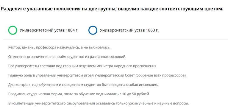Разделите указанные положения на две группы: Университетский устав 1884 и 1863.