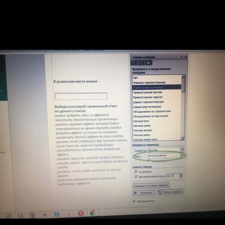 Указать звуковой эффект который будет проигрываться при переходе слайда