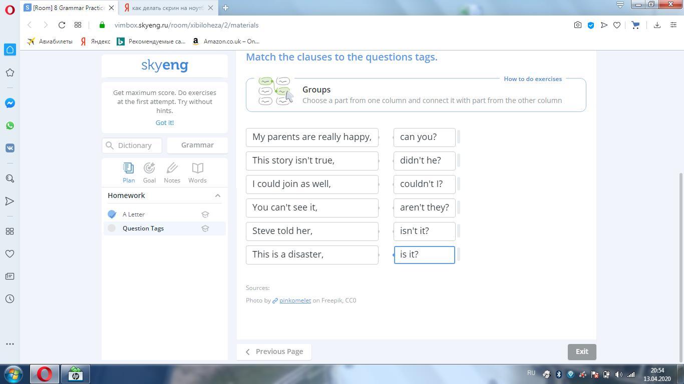 первый вопрос ответ: aren't they? второй вопрос is it? 3: coudn't I? 4: can you? 5: didn't he? 6: isn't it?