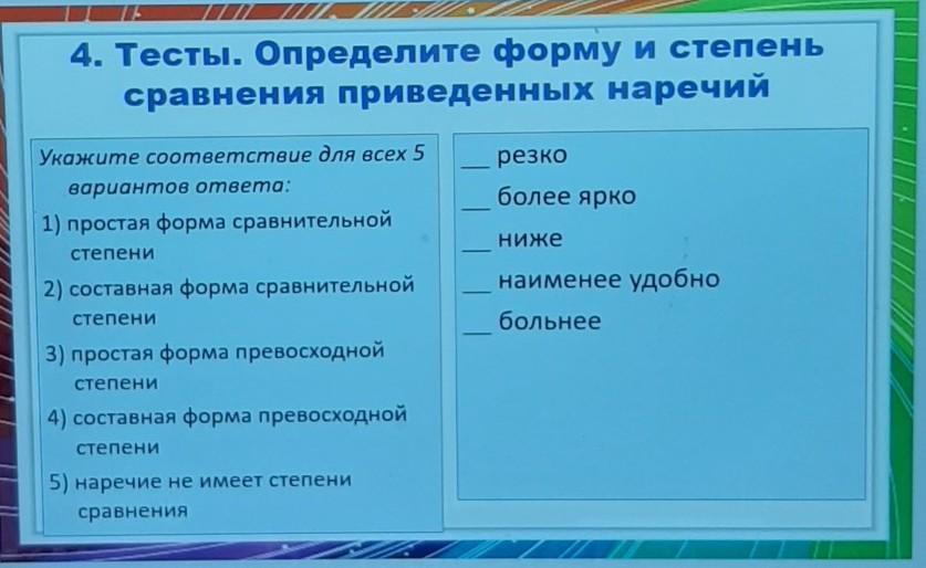 Ответ:1-больнее 2-более ярко 3-ниже(не точно) 4-наименее удобно 5-резко
