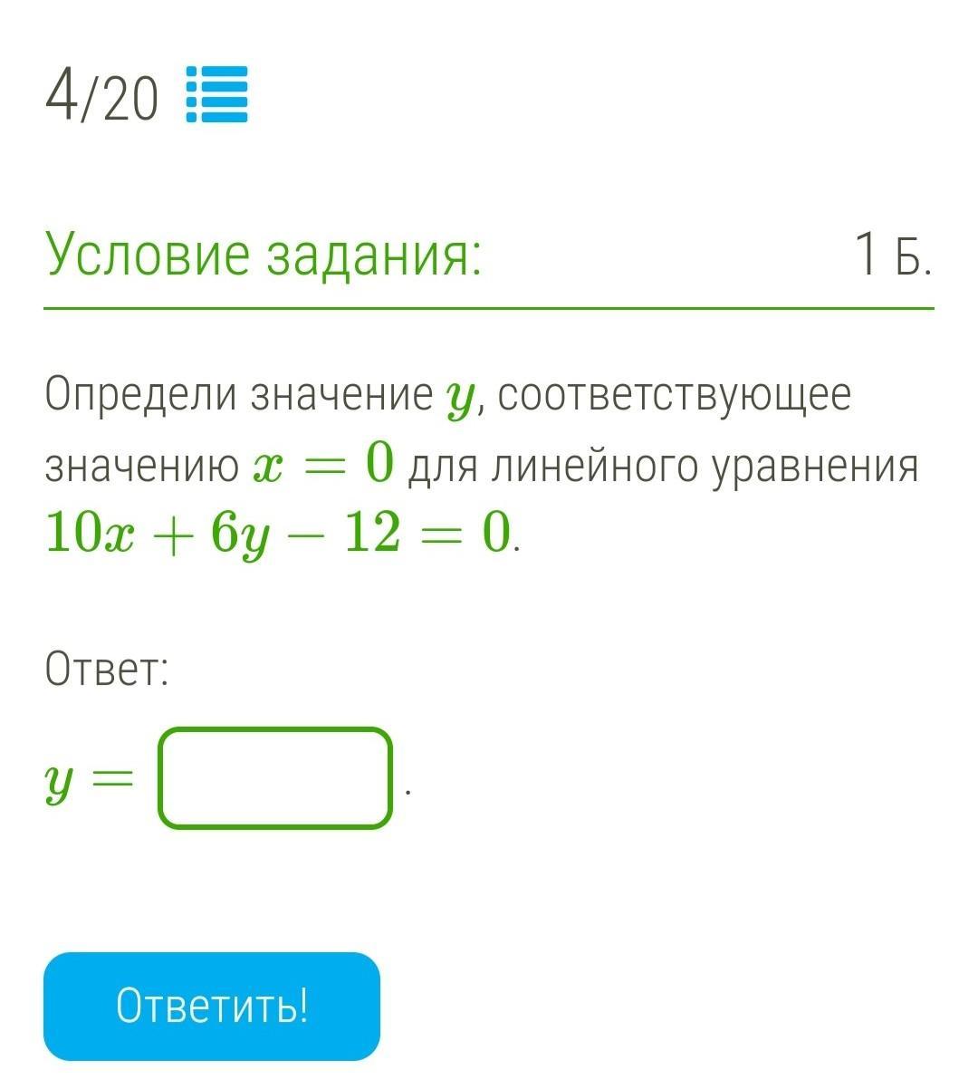 Определи значение y, соответствующее значению x=0 для линейного уравнения 10x+6y−12=0.