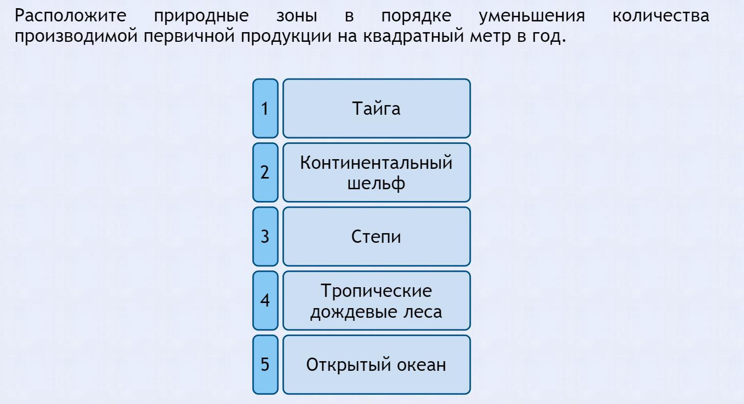 Расположите природные зоны в порядке уменьшения количества производимой первичной продукции на квадратный метр в год.