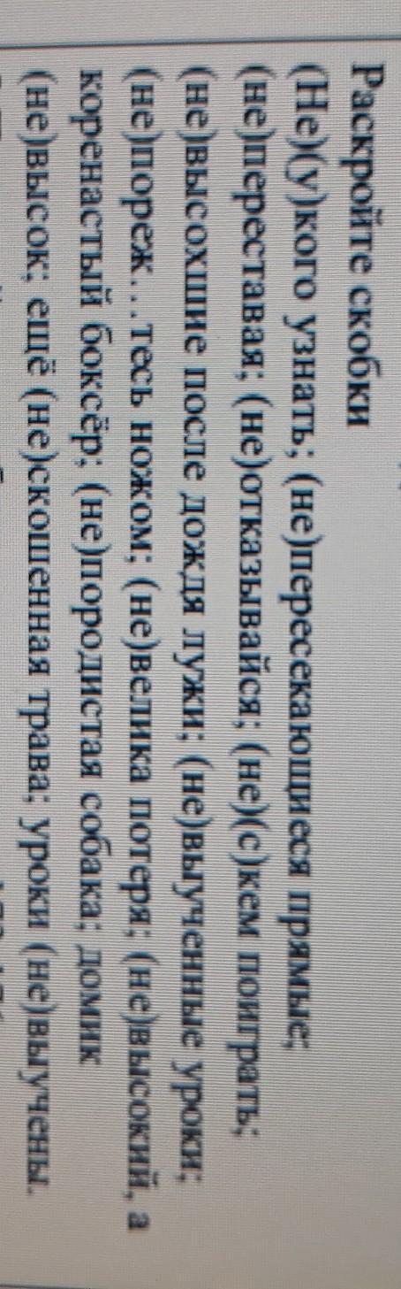 Не у кого узнать, непересекающиеся прямые, не переставая, не отказывайся, не с кем поиграть, не высохшие после дождя лужи, невыученные уроки, не порежьтесь ножом; невелика потеря; не высокий, а коренастый боксер; непородистая собака; домик невысок; вопиющая неграмотность; не пишите некрасиво.