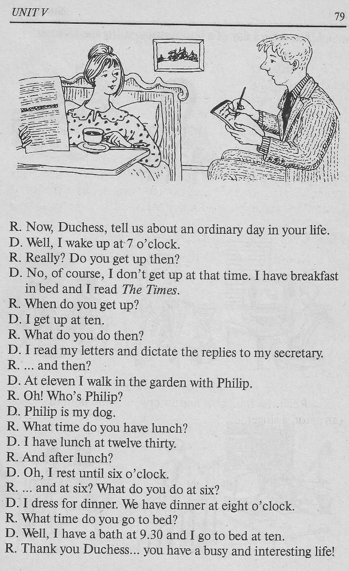R - Теперь, Герцогиня, расскажите нам об обычном дне в Вашей жизни.
