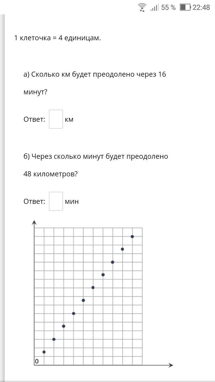 Используя график функции, Ответьте на вопросы. А) 1 клеточка=4 единица сколько км будет преодолена через 16 минут ? Б) Через сколько будут преодолены 48 километров?