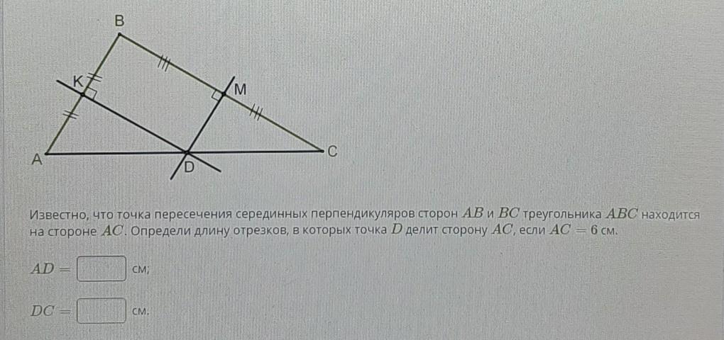 на стороне AC. Определи длину отрезков, в которых точка D делит Сторону АC, если AC = 6 см.
