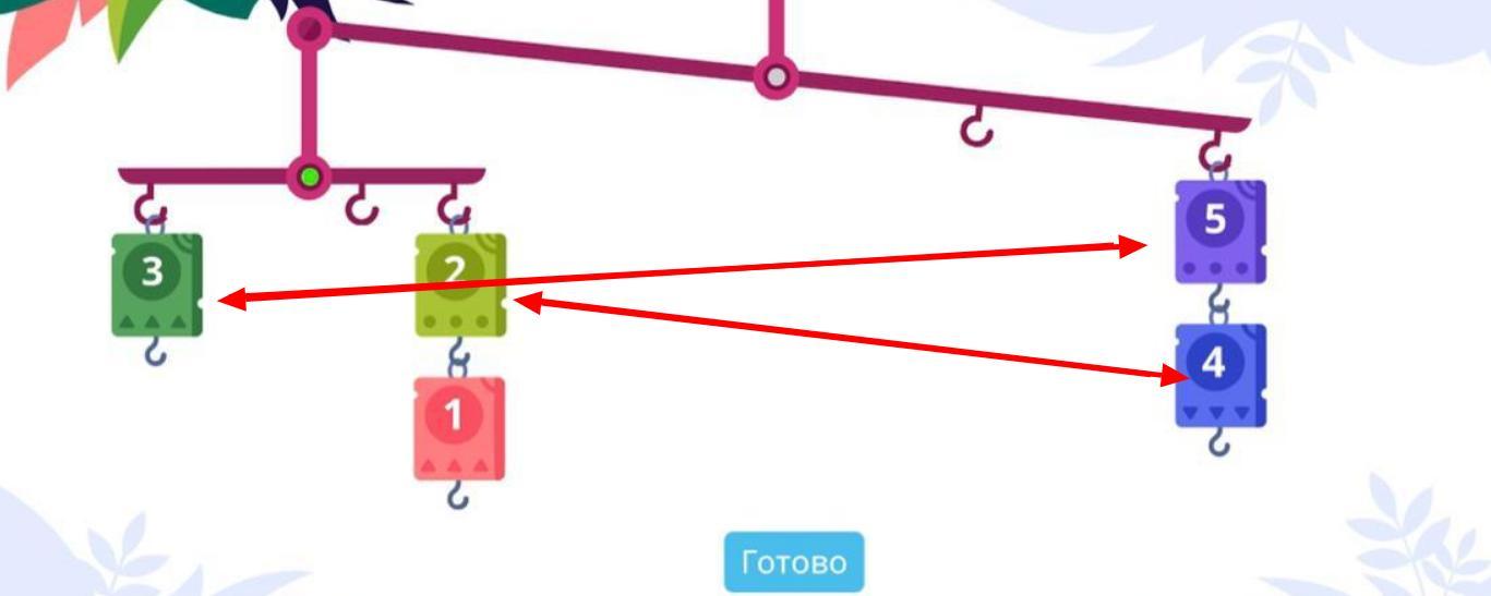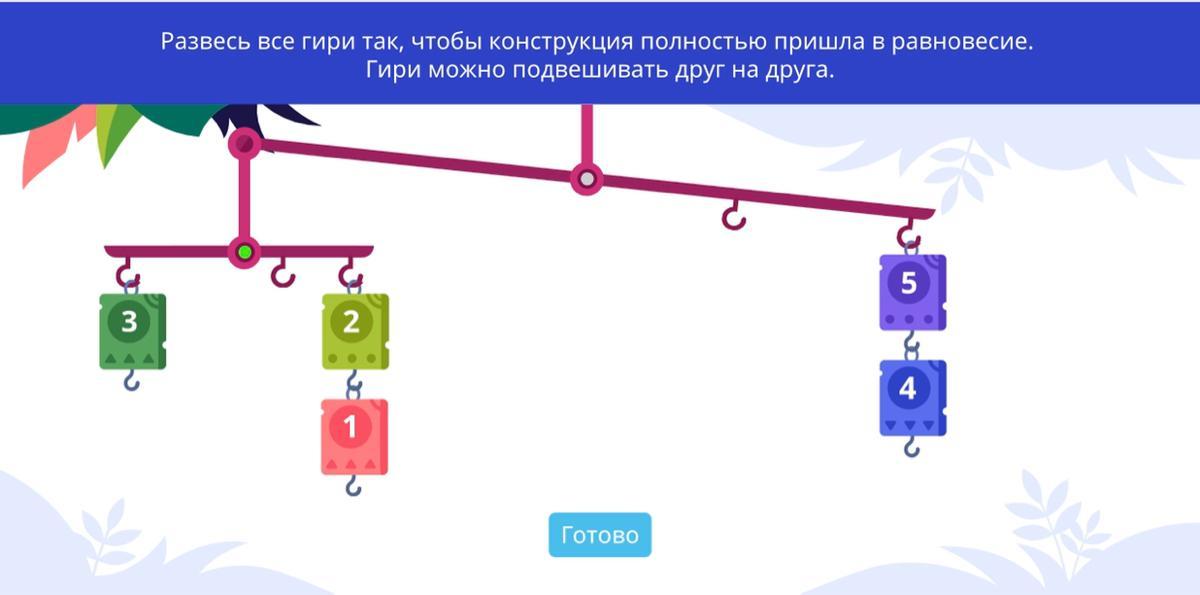На левой стороне повесь гиры 2 и 4,а в правой 5 и 3 но 1 повесь на 5 тогда у тебя будет правильное равновесие