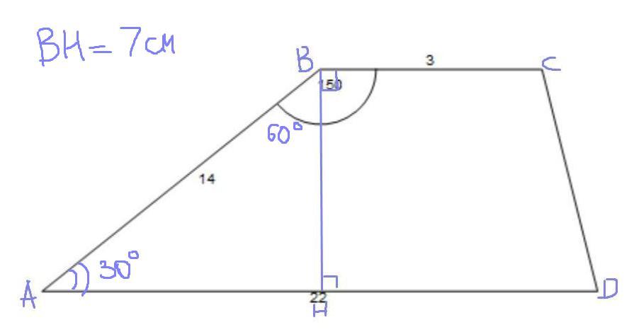 Основания трапеции равны 3 и 22, боковая сторона, равная 14 образует с одним из оснований трапеции угол 150°.