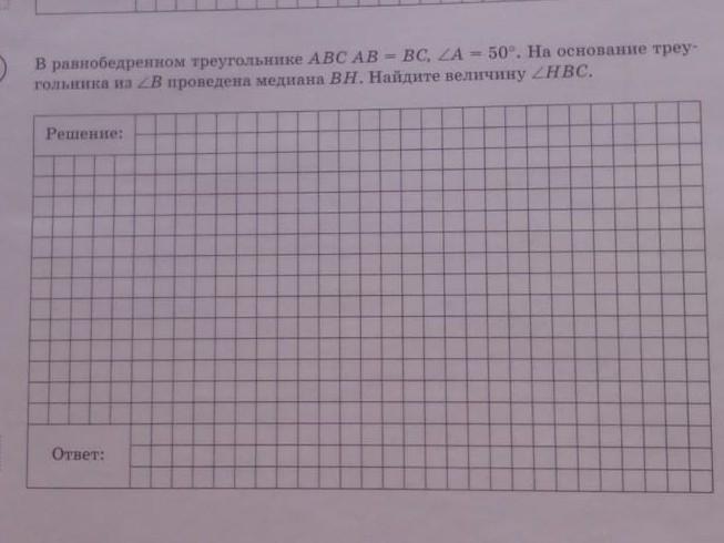 в равнобедренном треугольнике ABC AB=BC угол A=50°. На основании треугольника из угла B проведена медиана BH. Найдите величину угла BHC