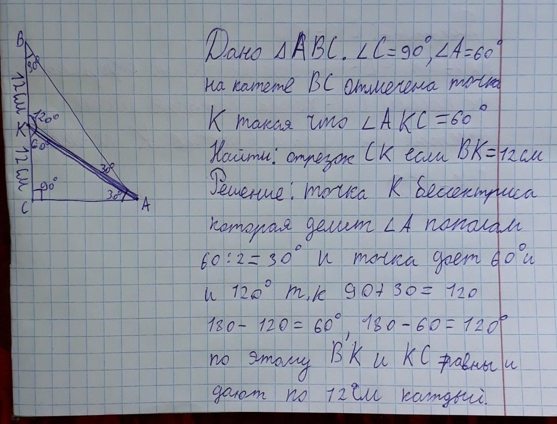 в треугольнике ABC известно что угол C=90 °, угол A=60°.на катете BC отметили точку K такую что угол AKC=60°. Найдите отрезок CK, Если BK=12СМ