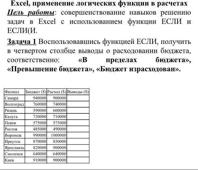 =ЕСЛИ(C2<B2;"В пределах бюджета";ЕСЛИ(C2=B2;"Бюджет израсходован";"Превышение бюджета"))