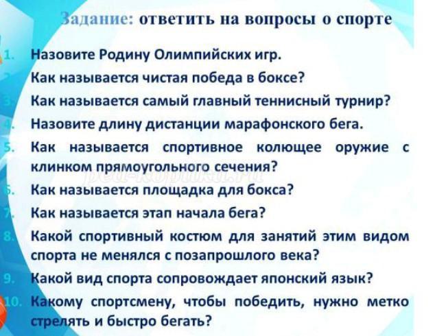 Ответ: 1) древняя Греция 2) Нокаут 3) Уимблдо́нский турни́р 4) 42 км 195 м 5) рапира 6) ринг 7) старт 8) Конный спорт 9) карате 10) Биатлонист