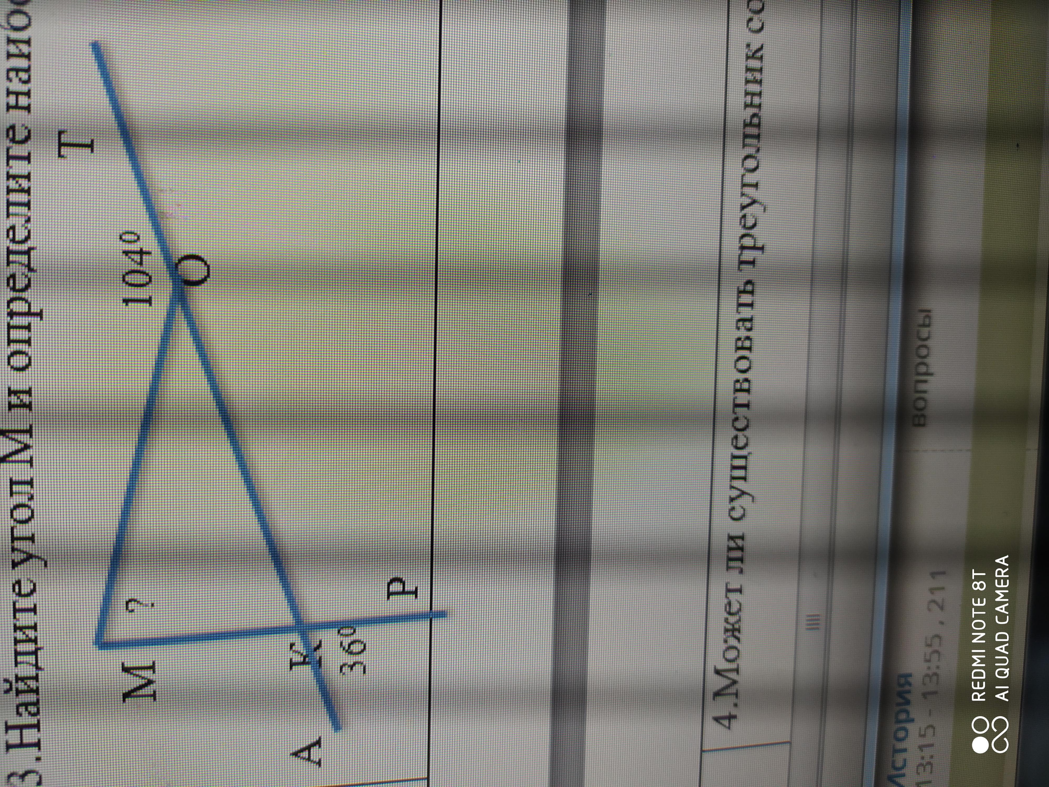Найдите угол M и определите наибольшую сторону треугольника KMO, если угол MOT равен 104 градуса, а угол AKP равен 36 градусов