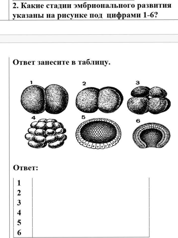 Какие стадии эмбрионального развития указаны на рисунке под цифрами 1-6
