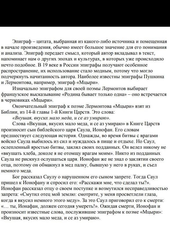 Познакомьтесь с текстом в файле. На основании прочитанного сделайте вывод : как связан эпиграф с образом главного героя поэмы Мцыри? При ответе подумайте чем, похожи и чем отличаются судьбы Мцыри и Ионофана? Какой смысл вкладывает Лермонтов в значение слов "мед"?