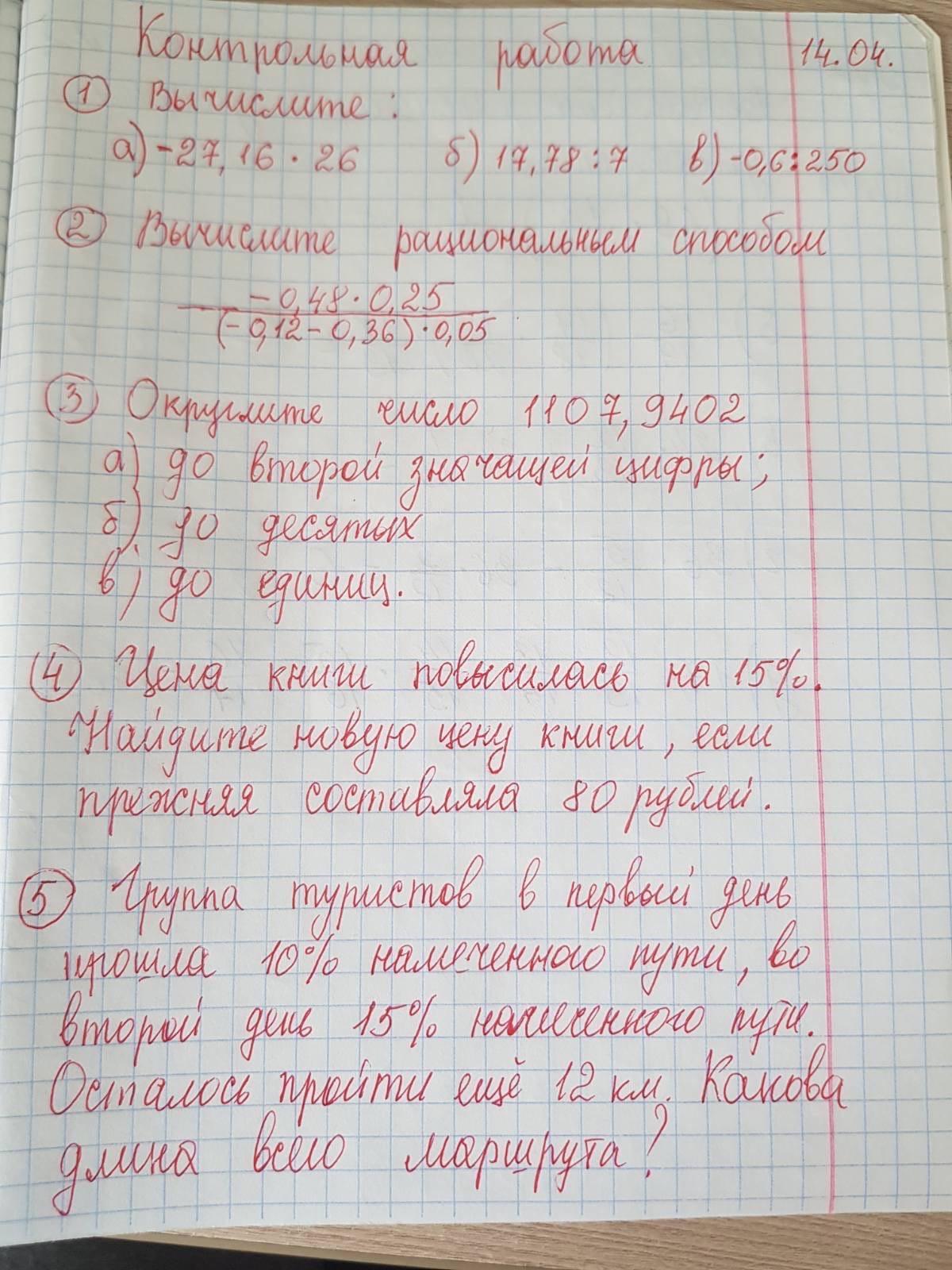 Пошаговое объяснение: 1) а) -27,16·26 = - 706,16 б)17,78 : 7 =2,54 в) -0,6 : 250 = - 0,0024 2) -0,48·0,25 / (-0,12-0,36)·0,05 =-0,48·0,25 / -0,48·0,05 = 0,25 /0,05 =25/5 =5 3) а) 1107,9402≈ 1100 б)1107,9402≈1107,9 в) 1107,9402≈1108 4) 1. 80·0,15=12 (руб) 2. 80+12=92 (руб) новая цена №5 1) 10%+15%=25% пути пройдено 2) 100%-25% = 75% пути осталось 3) 12:0,75= 12:75·100= 16 км (весь маршрут)