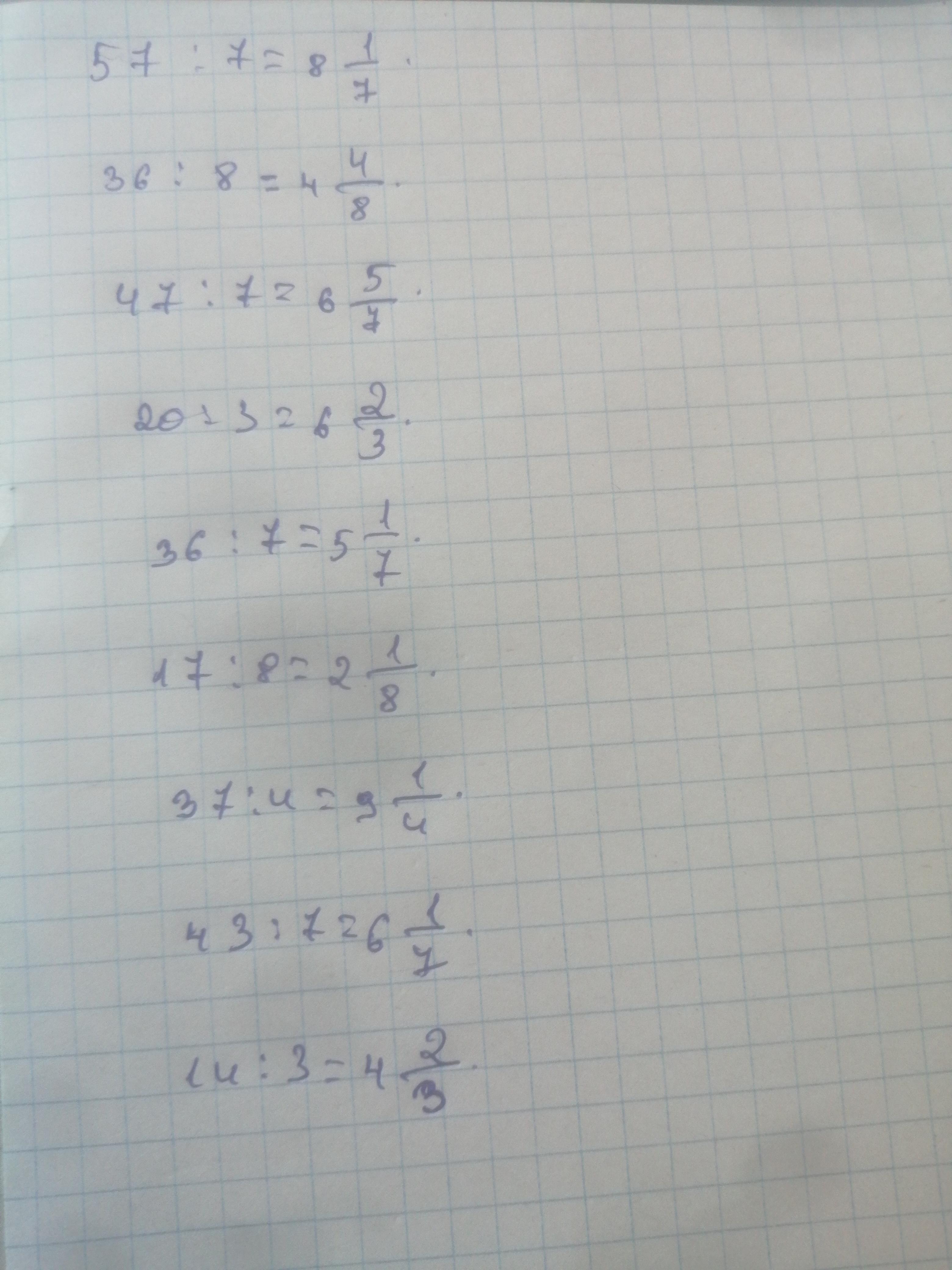 Решите деление ПЛИЗ!!!! 57 : 7 36 : 8 47 : 7 20 : 3 36 : 7 17 : 8 37 : 4 43 : 7 14 : 3