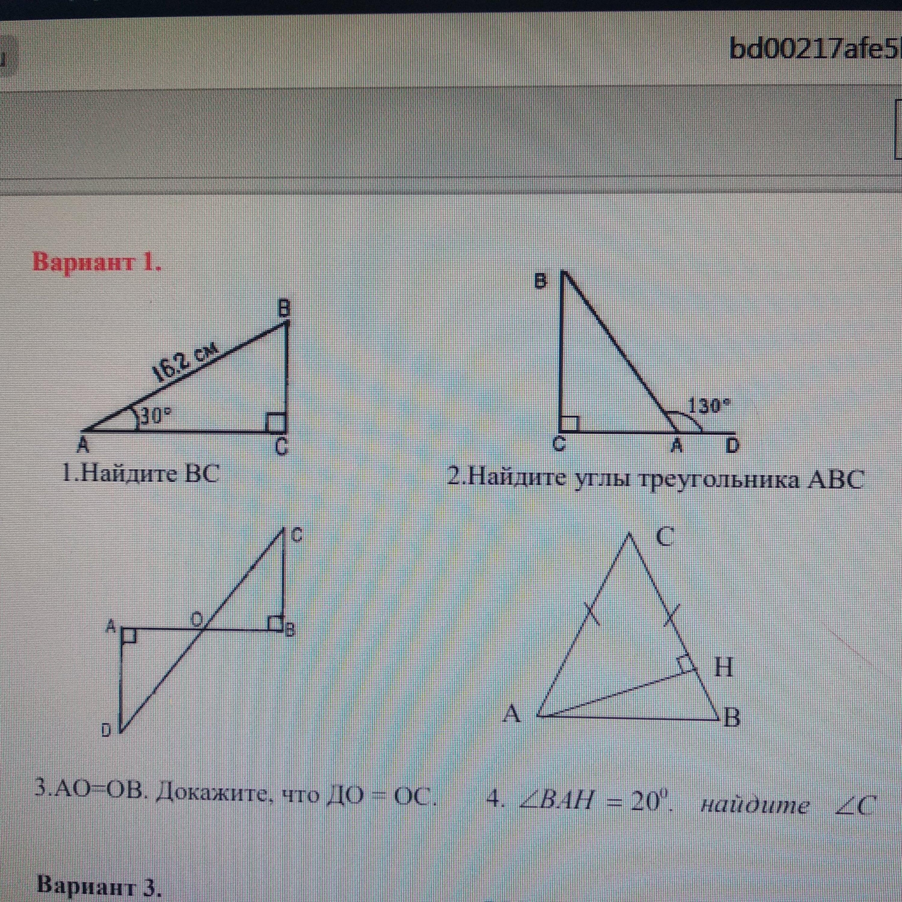 Углы А иВ прямые углы при пересечении вертикальные, равны, и АО=ОВ по условию. Значит треугольники равны. И ДО=ОС.
