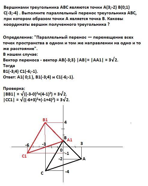 ПОМОГИТЕ !!! Вершинами треугольника ABC являются точки A(3;-2) B(0;1) C(-3;-4) . Выполните параллельный перенос треугольника ABC, при котором образом точки A является точка B. Каковы координаты вершин полученного треугольника ?