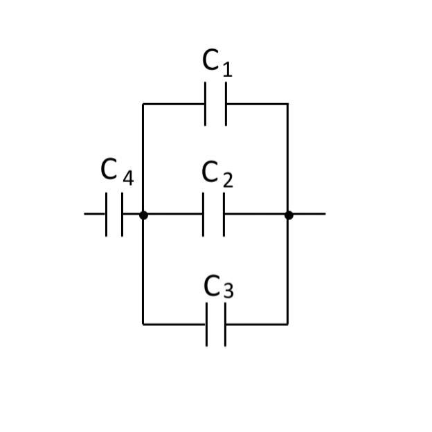 Если С1=С2=С3=С4, определите электрическую емкость батареи конденсатора, указанную на рисунке.