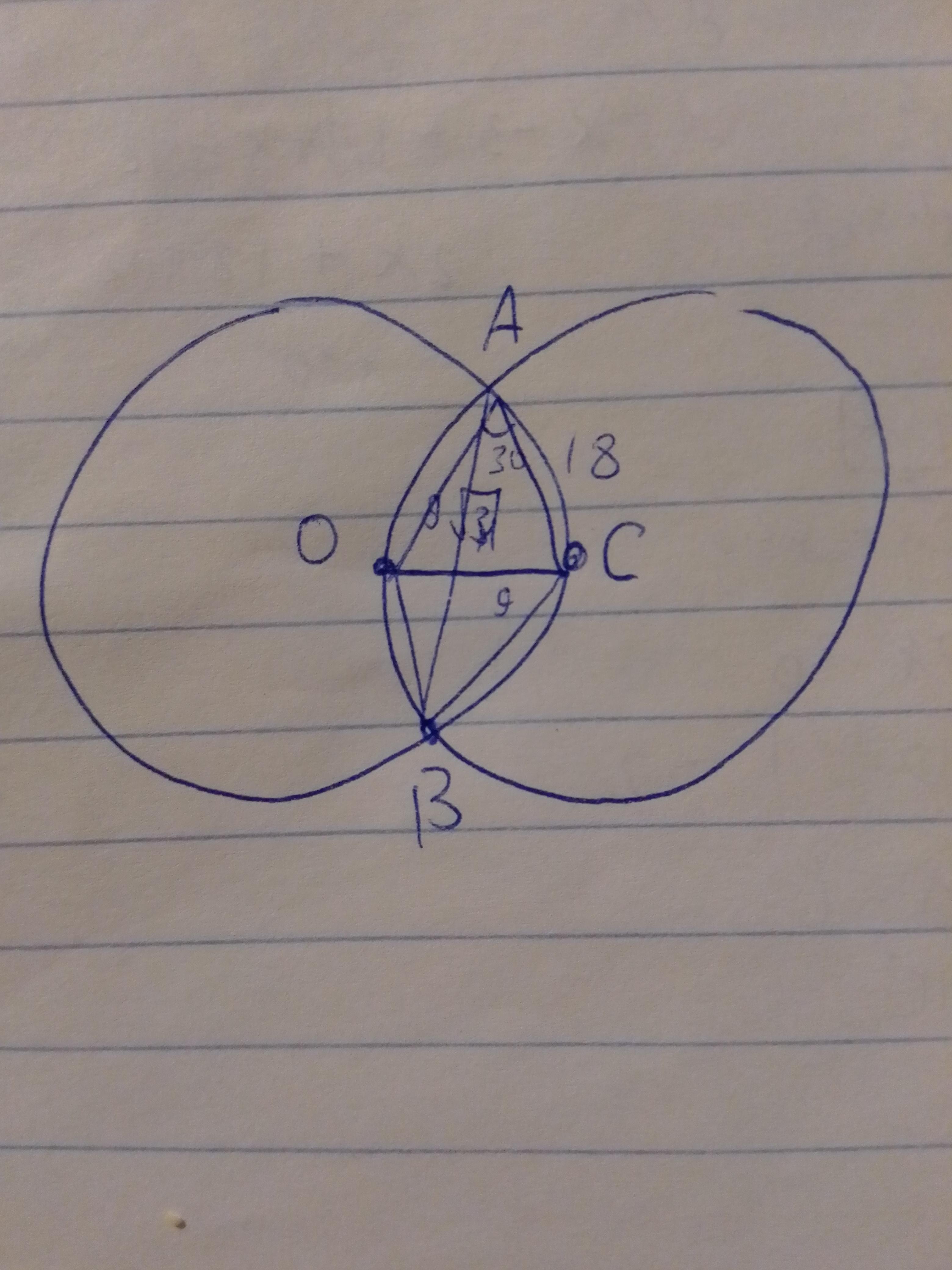 Если окружности равны, то и из радиусы тоже равны.Рассмотрим ромб АОВС. ОС = 18, тогда НС=9.