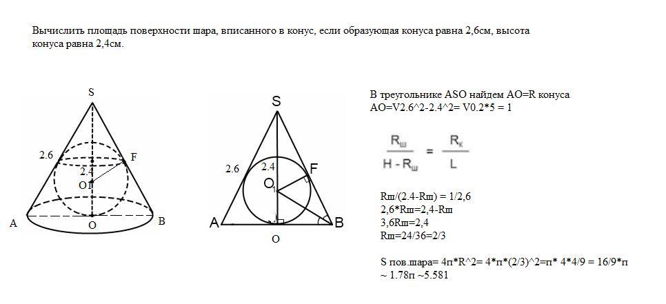 Вычислить площадь поверхности шара, вписанного в конус, если образующая конуса равна 2,6см, высота конуса равна 2,4см.