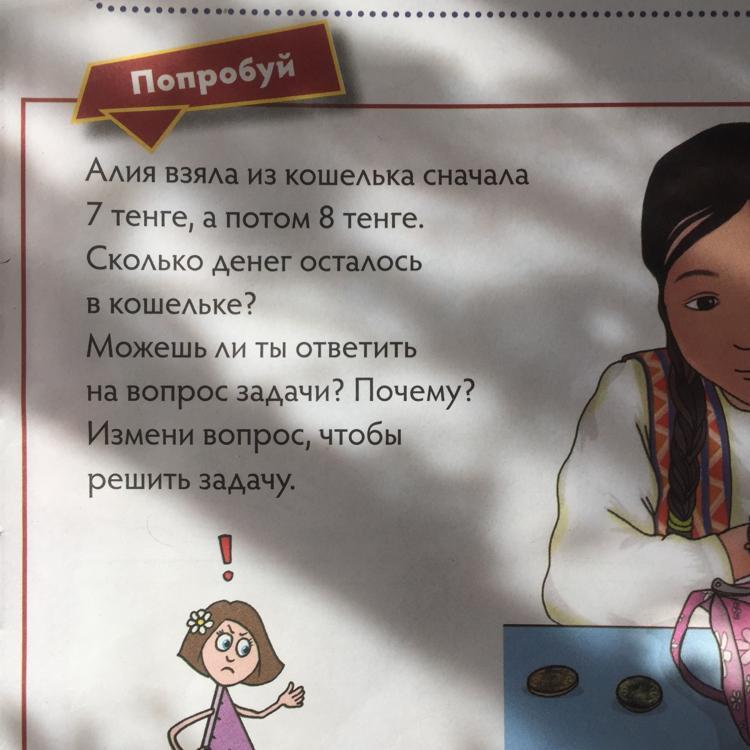 Алия взяла из кошелька сначала 7 тенге, а потом 8 тенге. Сколько денег оказалось у Алии?