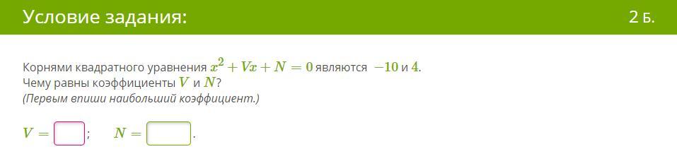 Корнями квадратного уравнения x2+Vx+N=0 являются −10 и 4.