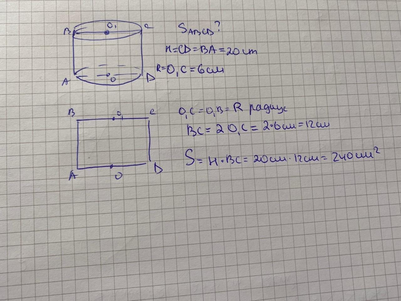 Найти площадь осевого сечения цилиндра, если его высота 20 см, а радиус основания цилиндра 6 см. *